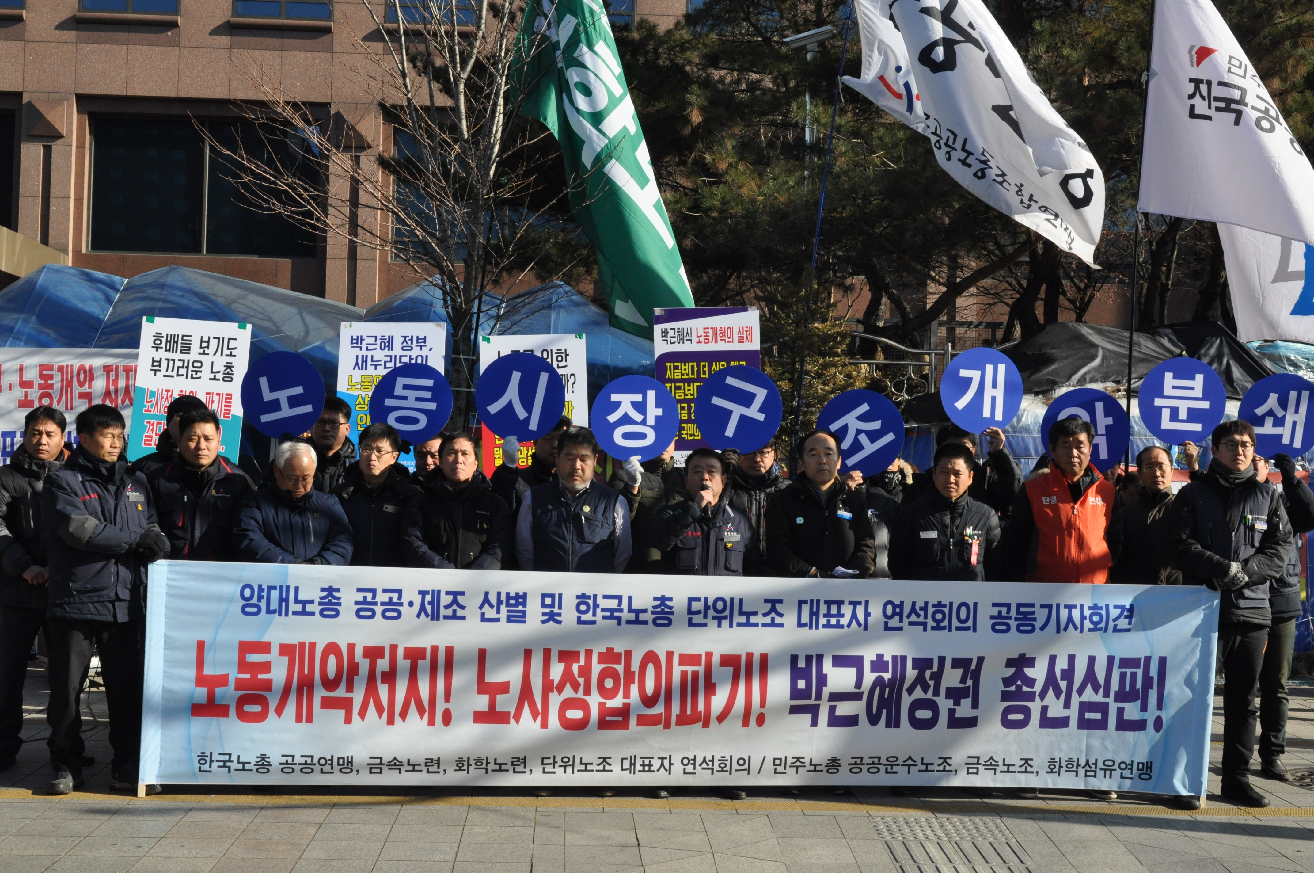 À̳¯ Çѱ¹³ëÃÑ °ø°ø¿¬¸Í, ±Ý¼Ó³ë·Ã, ÈÇгë·Ã ¹× ¹ÎÁÖ³ëÃÑ °ø°ø¿î¼ö³ëÁ¶, ±Ý¼Ó³ëÁ¶, ȼ¶¿¬¸Í »êº°³ëÁ¶ ´ëÇ¥ÀÚµéÀº ³ëµ¿°³¾Ç ÀúÁö¸¦ À§ÇØ, 4.13ÃѼ±¿¡¼ ¹Ú±ÙÇý Á¤±ÇÀ» ¹Ýµå½Ã ½ÉÆÇÇØ¾ß ÇÑ´Ù°í ÇѸñ¼Ò¸®·Î ¿ÜÃÆ´Ù.