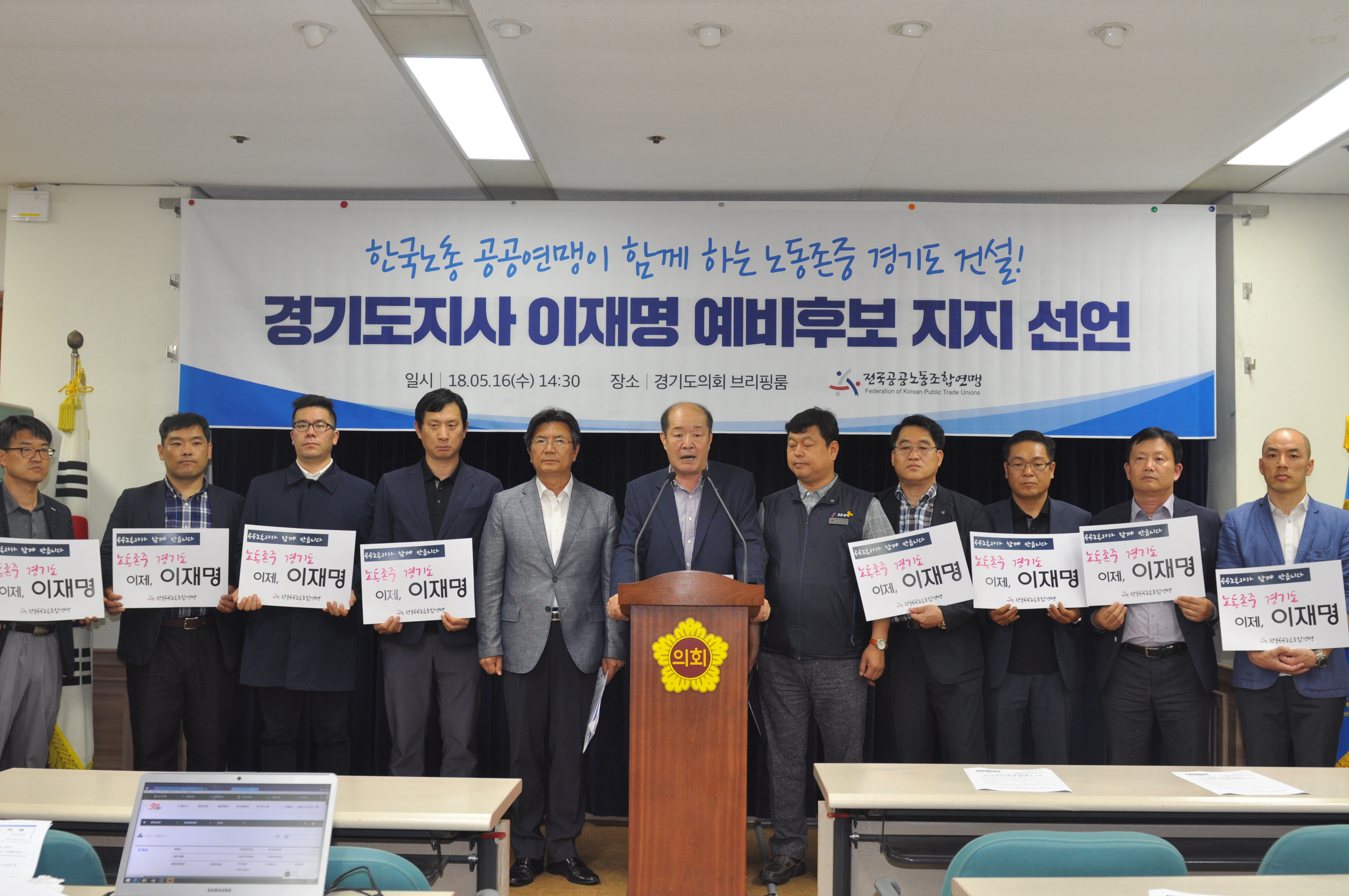 Àü±¹°ø°ø³ëµ¿Á¶ÇÕ¿¬¸Í(°ø°ø¿¬¸Í¡¤À§¿øÀå Ȳº´°ü)Àº 5¿ù 16ÀÏ ¿ÀÈÄ 2½Ã 30ºÐ °æ±âµµÀÇȸ ºê¸®Çη뿡¼ ³ëµ¿Á¸Áß °æ±âµµ¸¦ ¸¸µé ÀûÀÓÀڷΡ°´õºÒ¾î¹ÎÁÖ´ç ÀÌÀç¸í ¿¹ºñÈĺ¸¡±¿¡ ´ëÇÑ ÁöÁö¸¦ ¼±¾ðÇß´Ù. ¶Ç °ø°ø¿¬¸ÍÀº ÁöÁö¼±¾ðÀ» ½ÃÀÛÀ¸·Î 6¿ù 13ÀÏ Áö¹æ¼±°Å¿¡¼ ÀÌÀç¸í ¿¹ºñÈĺ¸ ´ç¼±°ú¡®³ëµ¿Á¸Áß °æ±â¡¯¸¦ ¸¸µé±â À§ÇØ Àû±ØÀûÀÎ Áö¿ø¿¡ ³ª¼°Ú´Ù°í ¹àÇû´Ù.