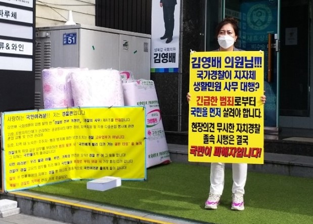 ÀÚÄ¡°æÂûÁ¦ Á¹¼Ó ÃßÁø¿¡ ¹Ý¹ßÀÌ °è¼ÓµÇ°í ÀÖ´Â °¡¿îµ¥ °æÂûûÁÖ¹«°ü³ëÁ¶(À§¿øÀå Á¤ÁöÇÑ)µµ ´ëÃ¥ ¸¶·ÃÀ» Ã˱¸ÇÏ°í ³ª¼¹´Ù.