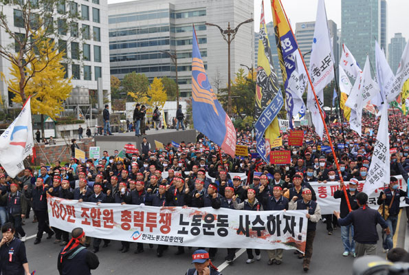 ¹Ý¸ñÀÇ ³ë»ç°ü°è¸¦ ¿øÇÑ´Ù¸é 100¸¸ Çѱ¹³ëÃÑ Àü Á¶ÇÕ¿øÀº Çö Á¤ºÎ¿¡ ¸Â¼ ÅõÀïÀÇ ±ê¹ßÀ» ³ôÀÌ ¼¼¿ì°Ú´Ù!¡±¶ó°í ¼±¾ðÇÏ¿´´Ù.