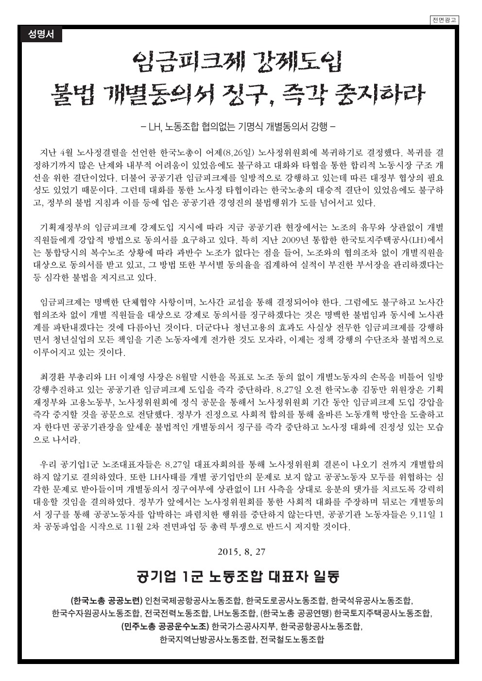 150827 °ø±â¾÷1±º³ëÁ¶´ëÇ¥ÀÚ ¼º¸í) ÀÓ±ÝÇÇÅ©Á¦ °Á¦µµÀÔ, ºÒ¹ý°³º°µ¿ÀǼ ¡±¸, Áï°¢ ÁßÁöÇ϶ó